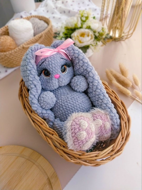 Вы точно влюбитесь в эту очаровашку! Зефирные ушки и огромные глаза под пушистыми ресницами… Изюминка — оригинальное оформление лапок с использованием фантазийной пряжи.