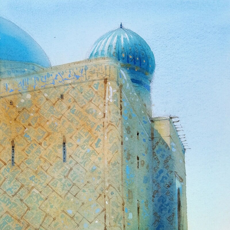 Рисуем сюжет с восточным настроением. Потренируемся грамотно вписывать фигуры людей в пейзаж. Поработаем над созданием орнамента на стенах мавзолея.