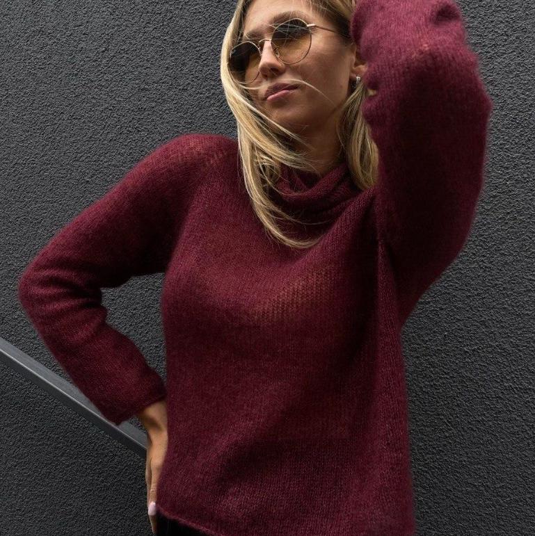 Конструкция: вяжется снизу вверх единым полотном поворотными рядами. Далее вязание делится на 3 части: правая и левая полочки и спинка, которые вяжутся по отдельности и сшиваются плечевым швом. Рукава вяжутся сверху вниз из проймы.