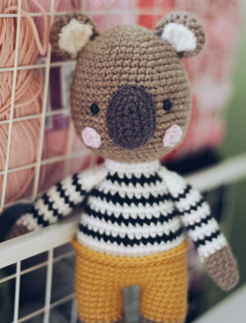 Игрушка вяжется снизу вверх одной деталью, ручки ввязываются по ходу вязания тела, хвостик вывязывается. Ушки пришиваются к игрушке.