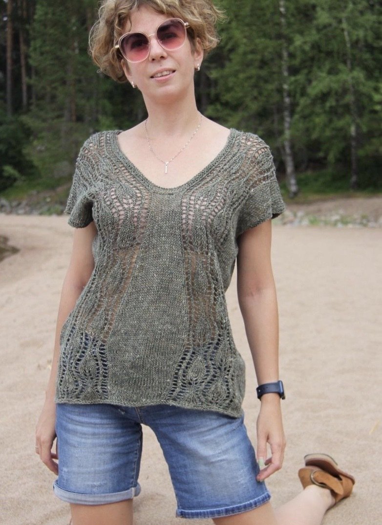 – Круглая глубокая горловина частичным вязанием с прямыми участками )(видео)