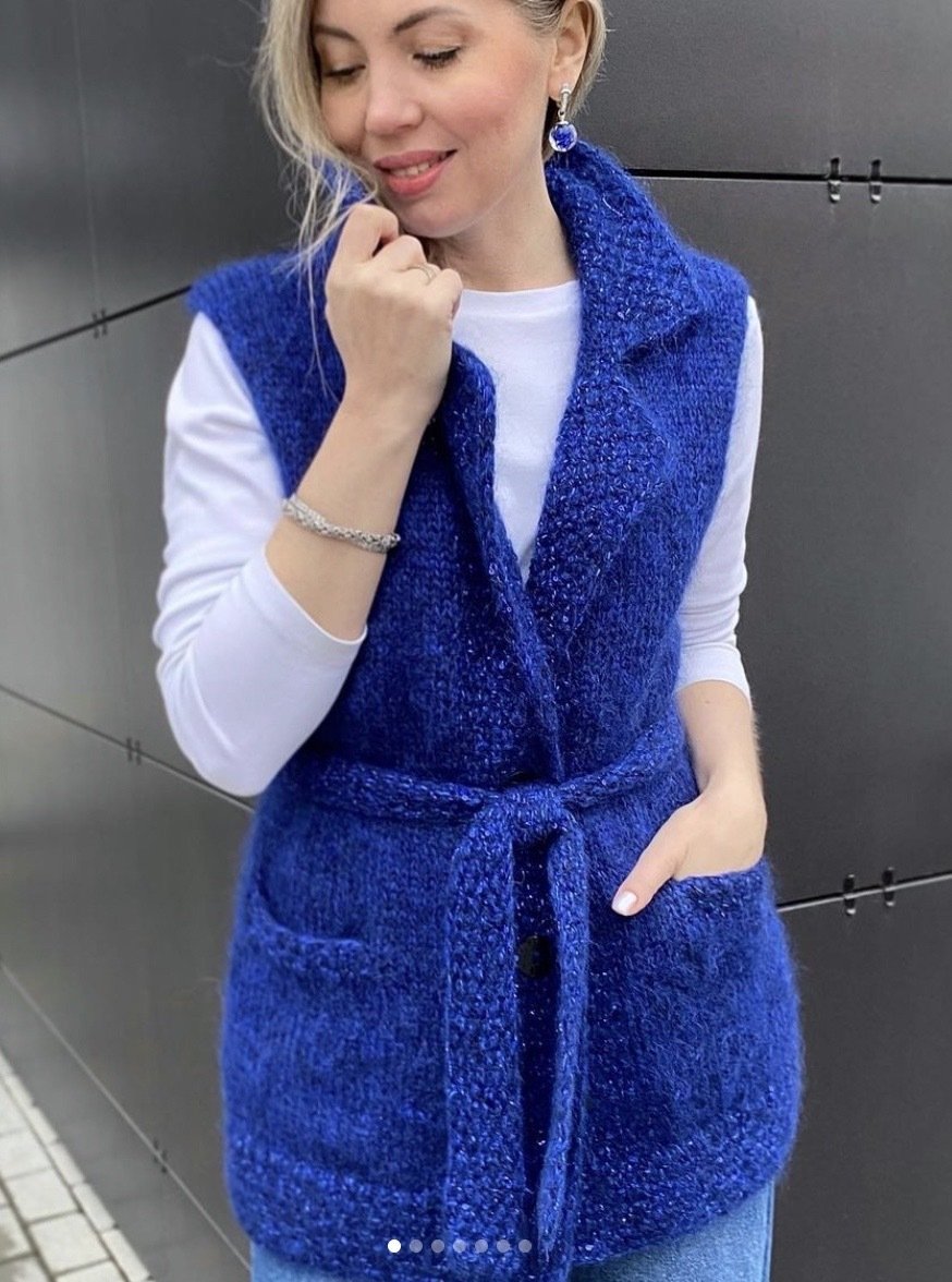 Уровень сложности средний. Требуемые навыки: вязание немецких укороченных рядов, выполнение тубулярного закрытия петель, выполнение двойной (подогнутой) планки горловины.