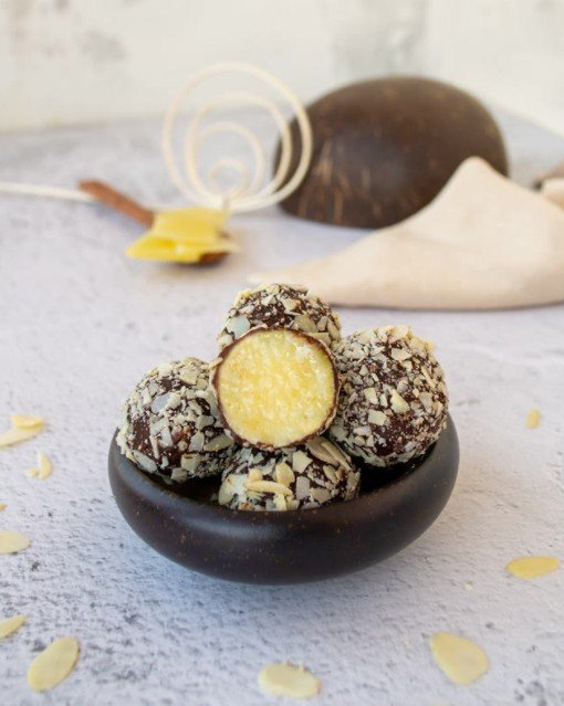 Хрустящая песочная основа с добавлением кокосовой муки и масла, сырный слой с мякотью свежего кокоса, кусочки ананаса, сырный слой со вкусом ананаса и добавлением ликёра «Пина колада», ананасовый гель и взбитый ганаш на белом шоколаде с ликером «Пина колада».