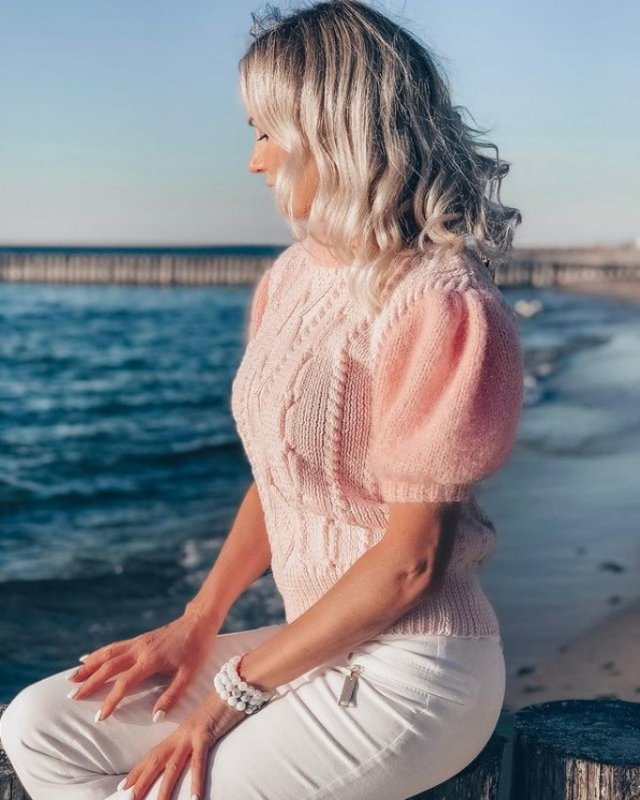 • Конструкция изделия: джемпер имеет укороченную длину, заниженную пройму и широкий рукав ,изделие вяжется снизу вверх по кругу до пройм,затем отдельно – спинка и перед, выполняются плечевые швы. Рукава набираем из пройм. Рукав имеет окат, который формируется частичным вязанием.