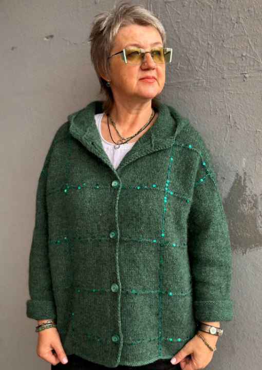 Футболка (джемпер с коротким рукавом) свободного облегания, вяжется по кругу снизу вверх. Рукава вяжутся отдельно. Обработка выполнена простой кеттлевкой.