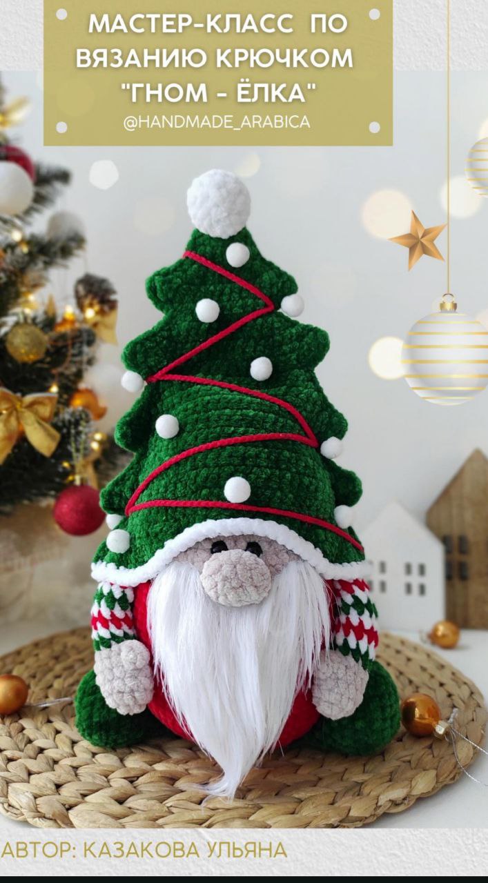 МАСТЕР-КЛАСС «Гном — Елка» МК в формате PDF, содержит 15 страниц подробного пошагового описания, 50 фотографий процесса, 6 видео сложных моментов Рост готовой игрушки примерно 35 см. Уровень сложности — средний. МК не содержит уроков по вязанию, необходимы базовые знания вязания крючком. Моя онлайн помощь на любом этапе вязания