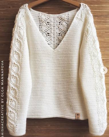 Вязаный кардиган GreatLove выполнен без швов сверху вниз. Сначала вяжут отдельно воротник. Затем вы поднимаете петли по набранным петлям для спинки и формируете горловину спинки укороченными рядами. Продолжайте вязать спинку на длину проймы. После поднимают петли для переда и воротника и вяжут обе полочки симметрично на длину проймы. После спинку и полочки присоединяют и вяжут тело узором до края карманов и затем до резинки низа. После поднимают петли вдоль проймы и вяжут рукава по кругу узором. В конце вяжут подкладку карманов и пришивают ее на место.