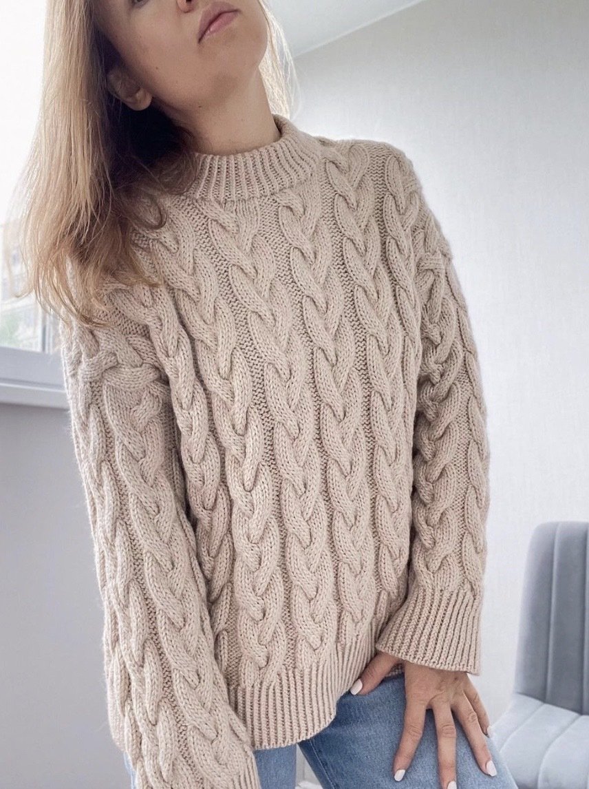 Пуловер состоит из двух частей, которые соединяются через закрытие петель. Рукава вяжутся от проймы по кругу. В вязании свитера присутствуют различные типы узоров с косами. Вырез горловины и края пуловера отделаны скрещенной резинкой.