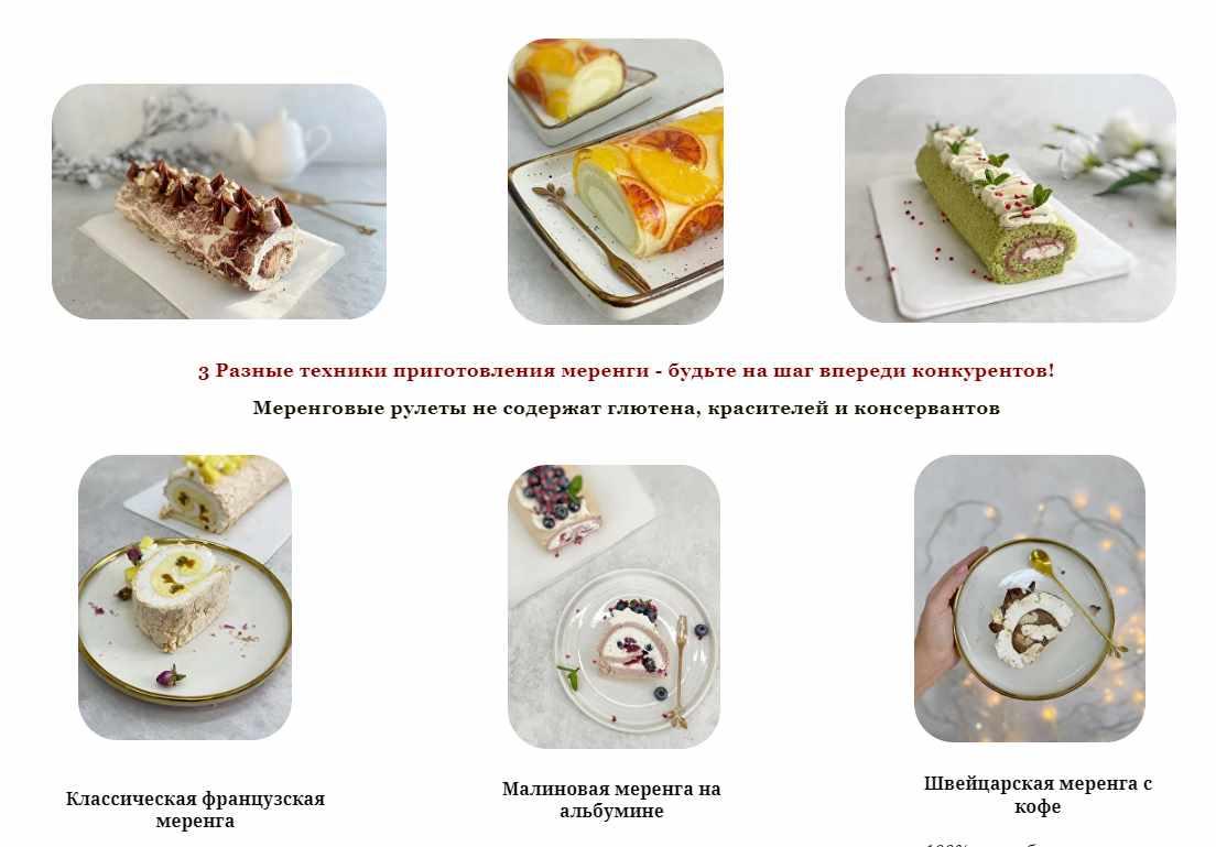 Вы получите: материалы практического мастер-класса по меренговому рулетуод + подробную техническую карту и список продуктов, которые пригодятся для курса.