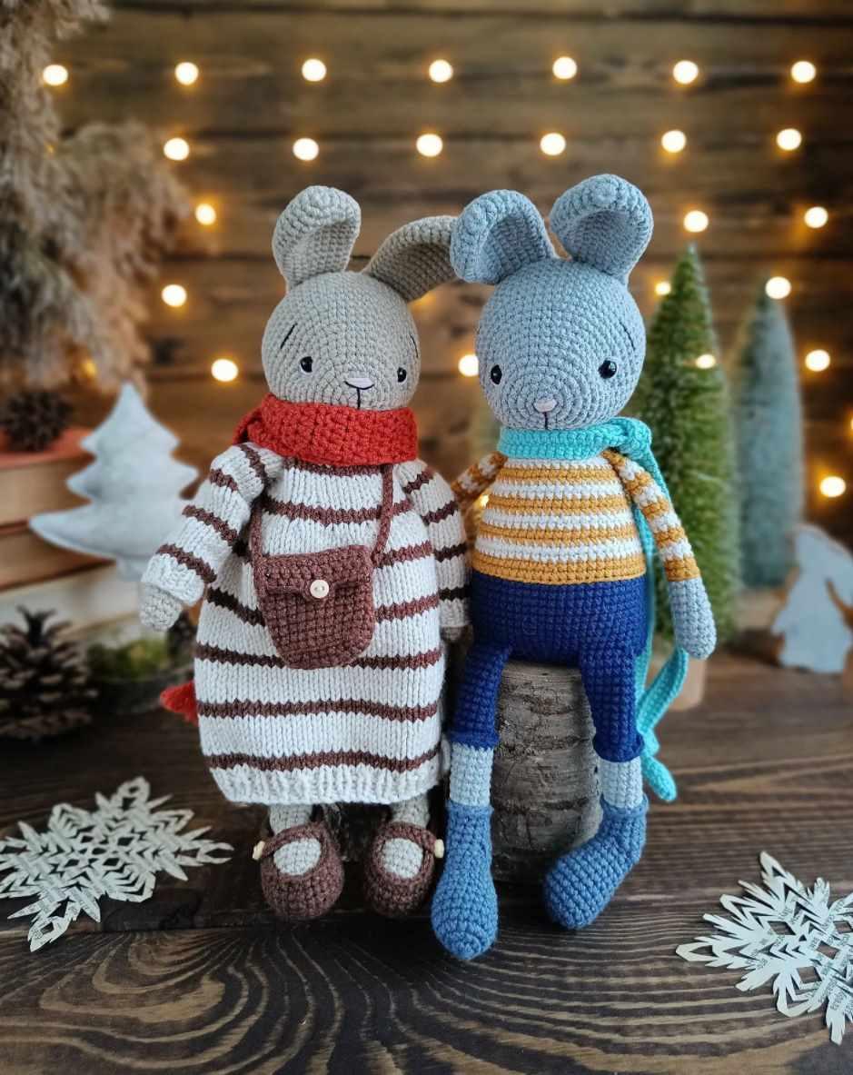 По описанной ниже схеме Вы сможете связать не только зай-чиков, но и одежду для них (штанишки, платье и бантик), а так же маленькую морковку