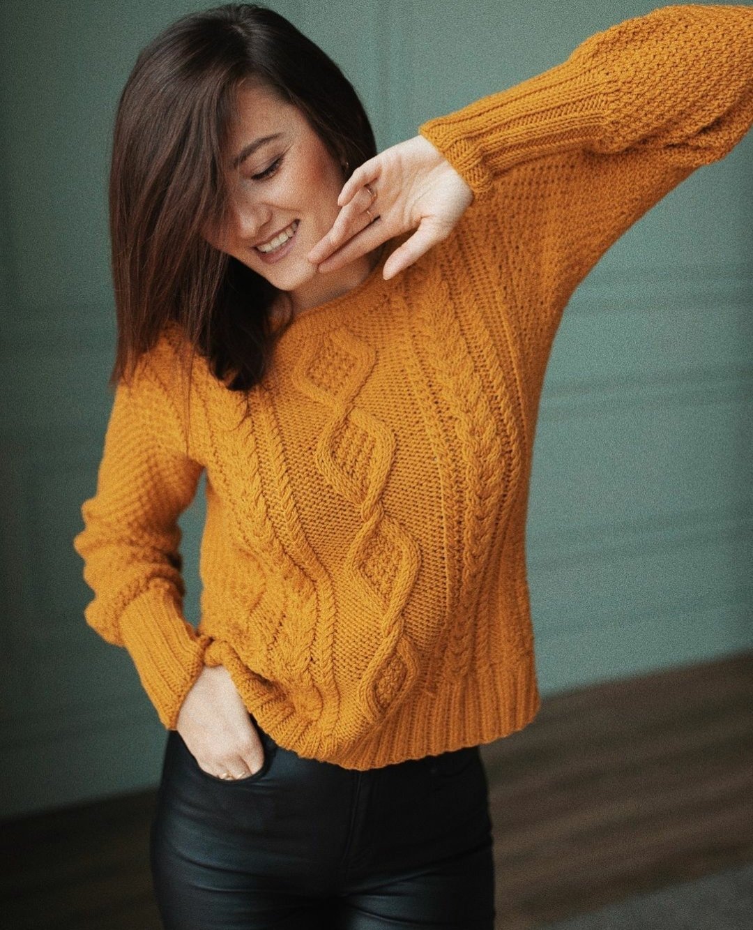 Этот дизайн сочетает в себе различные структуры, косы и араны в пуловере, который вяжется сверху вниз.