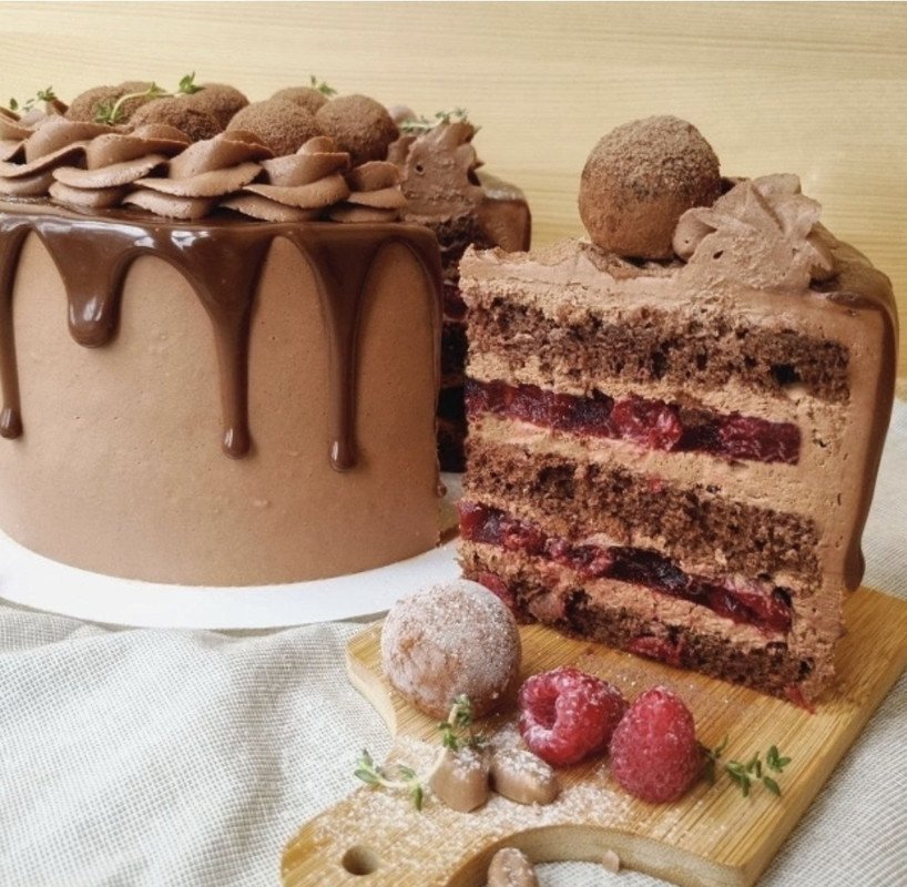 Этот торт, будто багряная вишня запорошенная снегом. Знакомый уютный вкус песочного пирога с вишней в сметанной заливке в эстетике современного торта