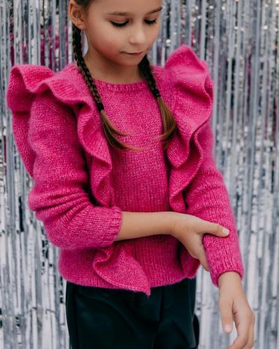 Изделие вяжется сверху вниз. Сначала выполняется спинка, затем от скосов плеч набираются петли для погона. От погон вывязываются полочки. После формирования пройм добираются петли подрезов, и детали переда и спинки объединяются в одно полотно. На горловине выполняется кетлевка, после чего вывязывается рубашечный воротник. Рукава вяжутся от пройм вниз с равномерными убавками по нижней линии. Планка выполняется в самом конце работы.