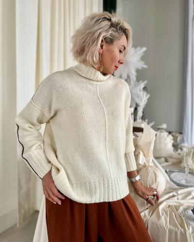 На модели показан джемпер размера 2 с припуском 39,5 см, физический обхват бюста у модели 89 см, обхват бедер 98 см.