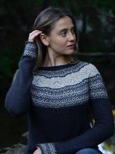 В Атлантический Канаде Барашуа – это лагуна, отделенная от океана галькой или скалой (песчаная полоса редкость для этих мест!). Барашуа послужила источником вдохновения для джемпера Barachois свободного кроя в стиле пончо. Сначала выполняется полоса жаккарда по кругу. Затем петли поднять с обеих сторон этой полосы и продолжать в разных направлениях лицевой гладью и ажурным узором.