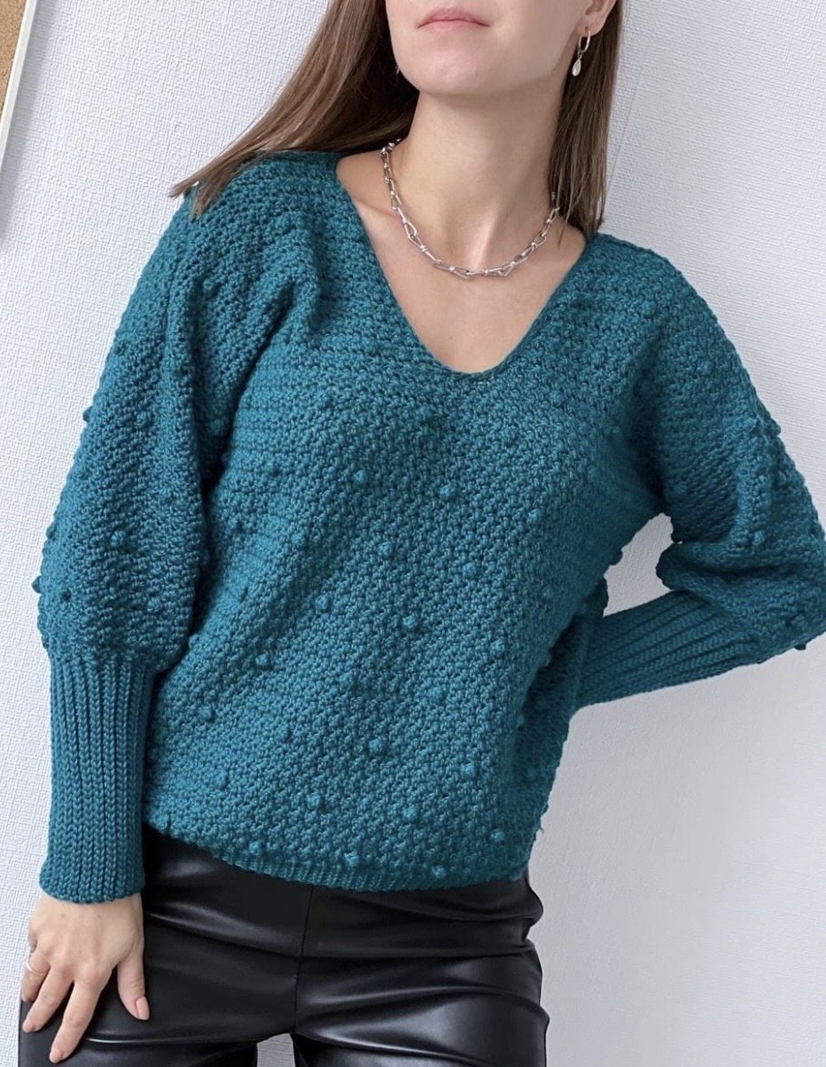 Свитер оверсайз вяжется спицами сверху вниз. Автор вязала свитер из пряжи средней толщины (Aran weight). Вы бирайте пряжу на свой вкус, ориентируясь на плотность образца.